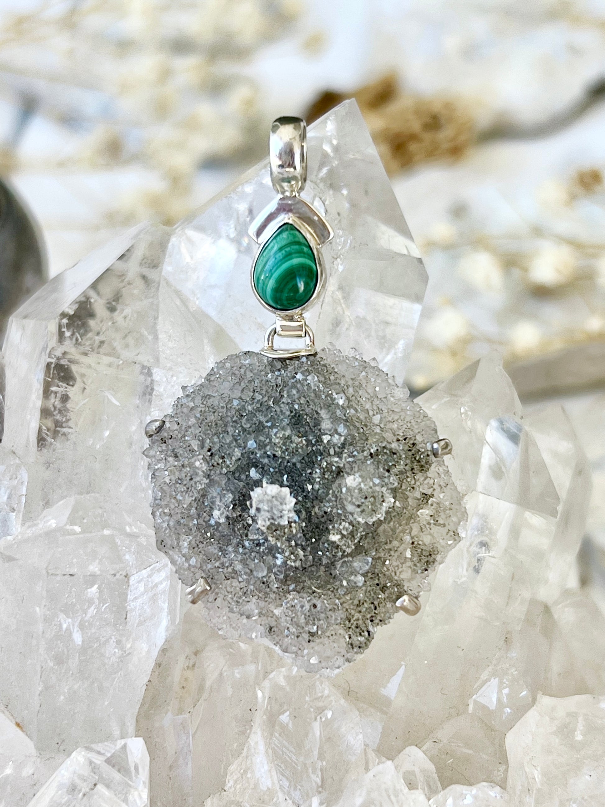 When combined, druzy agate and malachite create a synergistic effect, blending the grounding and balancing properties of agate with the transformative and protective energies of malachite. This combination is believed to promote emotional balance, strength, and resilience. It can enhance one's ability to overcome challenges while staying grounded and connected. The combination is also thought to stimulate creativity and provide a sense of security and well-being.