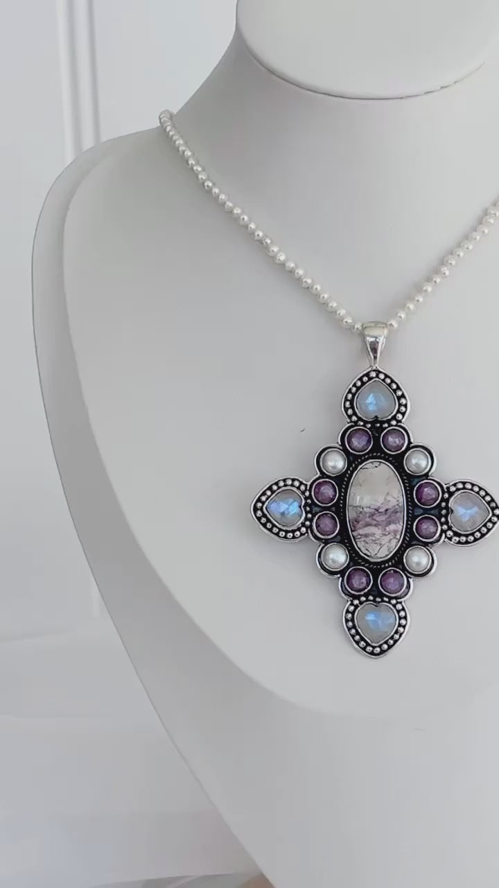 ‘The Elysian Cross: Whisper of Serenity’ Hyacinth Jasper, Moonstone, Ruby & Pearl Talisman Pendent HJP2 925